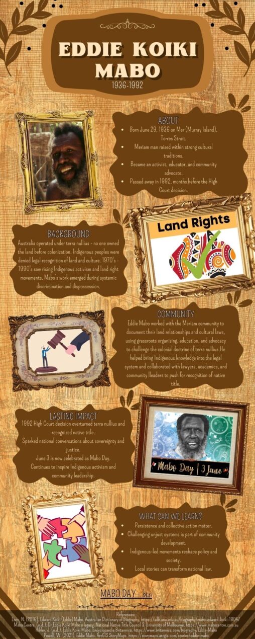 Eddie Koiki Mabo Infographic This infographic highlights a small portion of the life, activism, and lasting impact of Eddie Koiki Mado, a Meriam leader whose work transformed Indigenous…