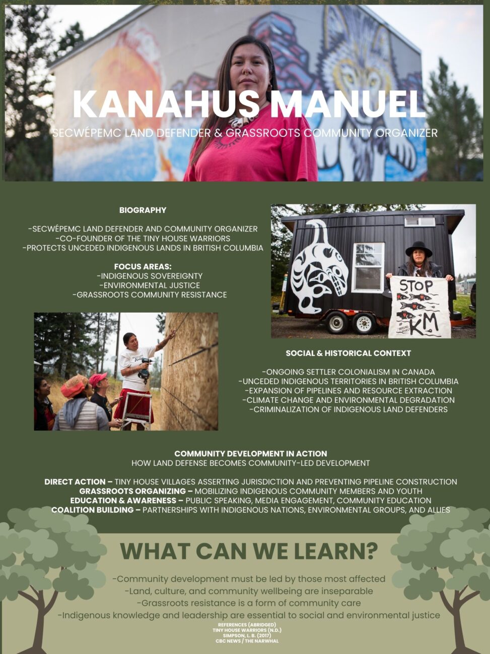 This infographic highlights the work of Kanahus Manuel, a Secwépemc land defender and grassroots community organizer whose leadership demonstrates how community development can be rooted in land, sovereignty, and collective care. Through initiatives such as the Tiny House Warriors, Manuel’s work challenges ongoing settler colonialism while creating community-led solutions that protect Indigenous territories, support housing, and resist environmental destruction. Her story illustrates that community development is not only about services or programs, but about self-determination, resistance, and the right of Indigenous peoples to define their own futures.